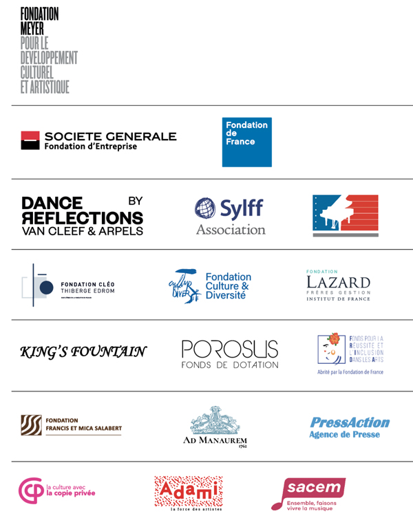 Acte 4, Agence Michel Ferranet Architectes, Albe Films, Alpha Classics - Arcana - OMF – Rewind (Outhere Music France), Anapak, Aouka, Art & Caractère, Association Française des Orchestres, Association Son/Ré, Assur&Sens, Athys, Atletico Records, Banco Music, Beau Geste, Beau Soir Productions, Bergerault Percussions Contemporaines, Bibliothèque Musicale La Grange-Fleuret, Bilboquet, BLB Associés, Centre Parisien de Recyclage, Changement de Décor, Centre National de la Musique - CNM, Compagnie Financière Chevrillon, Correspondances et Musique, Court-Circuit, École de Musique de Gif, Éditions Hit Diffusion - Hit Éditions, Éditions Raoul Breton, Énergie TP - Établissement Ile-De-France Ouest, Énergie TP - Établissement Ile-De-France Est, Enoch et Compagnie, Ensemble L'Arpeggiata, Ensemble Les Dissonances, Ensemble Vocal Sequenza 9.3, Erda Education Recherche Développement Artistique, Excellart, Festival Baroque de Pontoise, Fondation Royaumont, Graines d’Étoiles, Henri Selmer Paris, In Cauda, Independent Distribution On Line, JVDH Construction, Kawai France, La Briqueterie-Centre de Développement Chorégraphique du Val-De-Marne, La Coopérative, L'Agence Artist Management, L'Atelier, Laurelenn - Atletico Music, Lazard Frères Gestion, Le Concert D’Astrée, Le Concert Spirituel, Le Jerez Le Cam Ensemble, Les Mots Le Corps et La Note, Ligne Python, Mezzo, Moonlight Productions, Mucho Music, Multilatérale, Musique Sacrée à Notre-Dame de Paris, Nagata Acoustics International Inc., Nexo, Orchestre de Picardie, Orchestre National de L'Ile-de-France, Pharmacie de L'Écusson, Pharmacie de Paris, Pianos Hanlet- Nova Sound, Po. Productions, Premières Loges, Productions et Éditions Serge Lama, Radio Classique, S.P.P., Sansha France, Société des Artistes Interprètes, Société nationale de Radiodiffusion Radio France, Sparkle Publishing, Spotify France SAS, Teitgen & Viottolo, Théâtre de L’Athénée, Théâtre Musical de Paris – Châtelet, Théâtre national de L'Opéra-Comique, Tiny Island, TSGT Décor, Warema France, Yalab, Yamaha Music Europe.